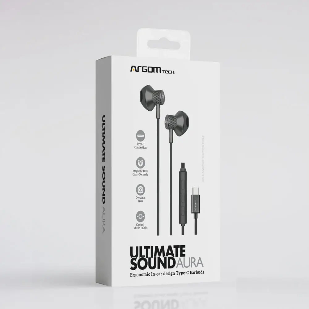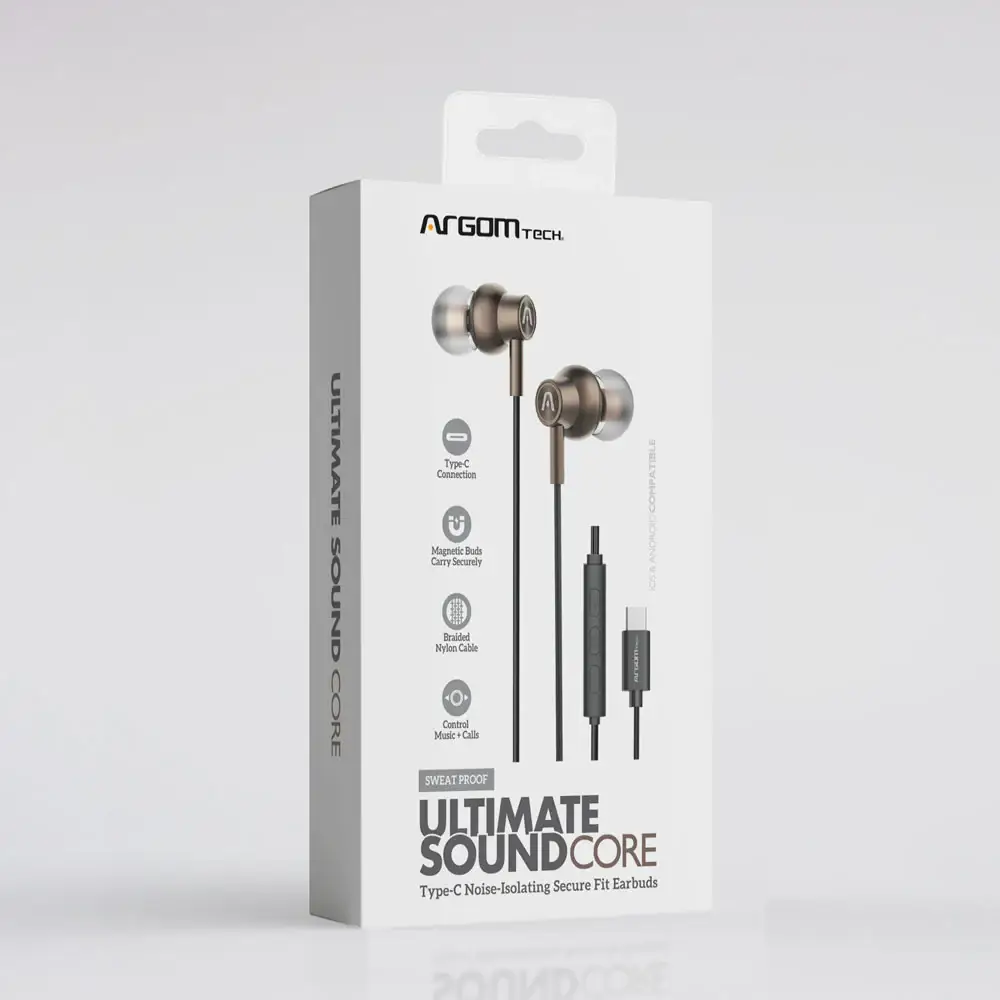 The ArgomTech Ultimate Sound Core (model ARG-HS-2030) is a pair of wired Type-C earphones designed for modern devices lacking a standard 3.5mm jack. They are characterised by a durable metal housing and magnetic buds that snap together for tangle-free storage.